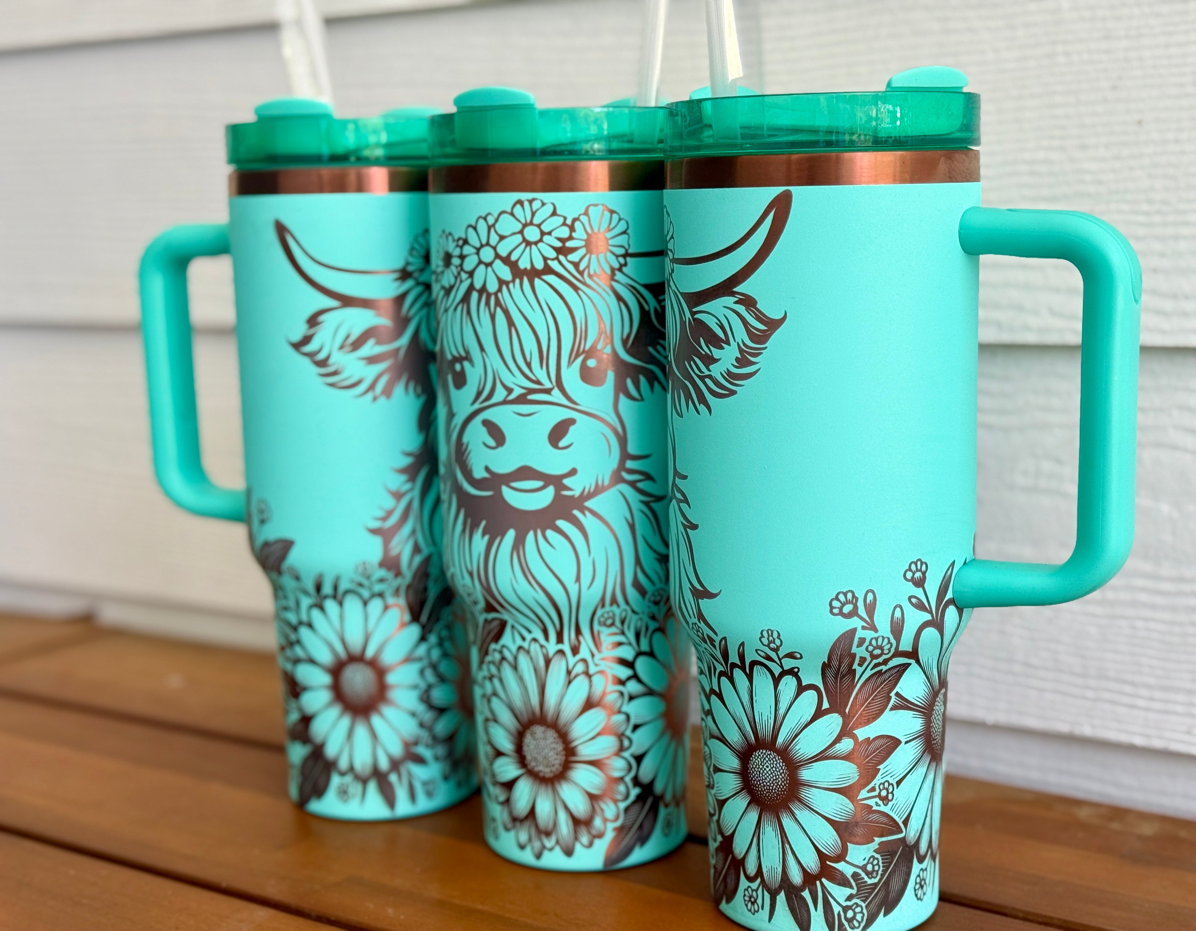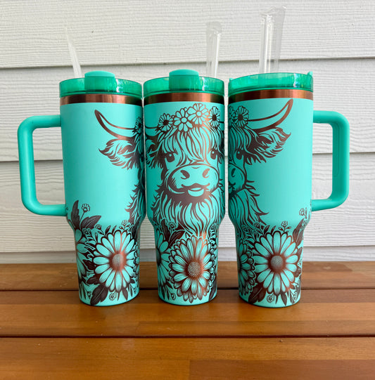 Highland Cow Full Wrap 40 oz Teal with Copper Core Tumbler with Straw P13175 -