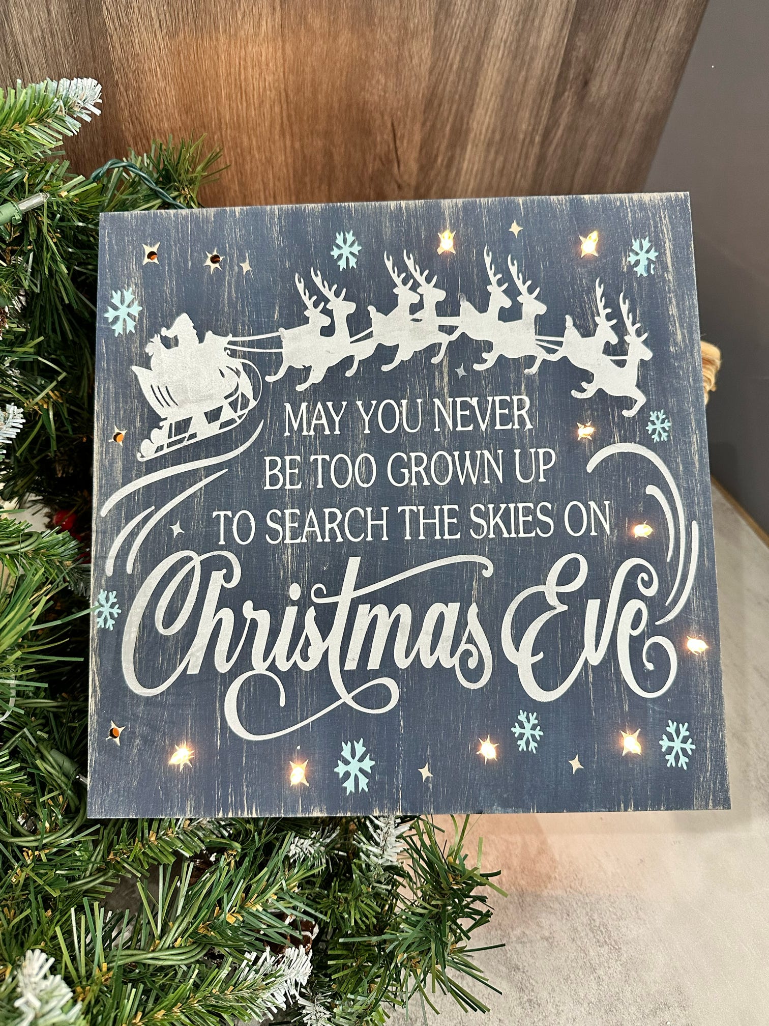 Get in the holiday spirit with our Christmas Eve Lighted Sign. Perfect for adding a festive touch to your home decor, this sign features a charming design and lights up to bring the magic of Christmas to any room. Spread cheer with this fun and playful addition to your holiday decorations.