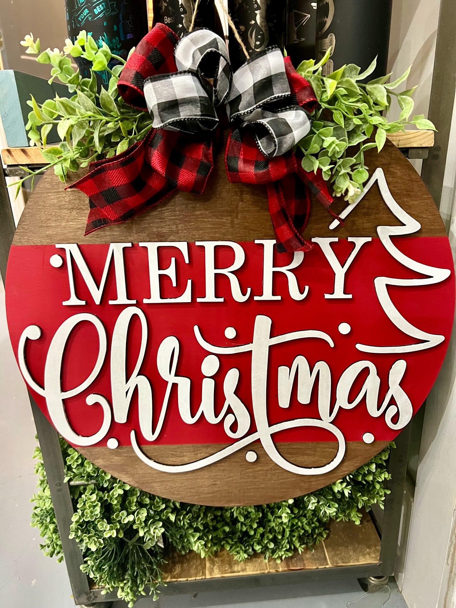 Welcome in the holiday season with our quirky Merry Christmas Side Tree Round Door Hanger. Perfect for adding festive charm to your front door, this hanger features a playful tree design and the words "Merry Christmas" in a unique font. Spread some holiday cheer with this fun and unique decoration.