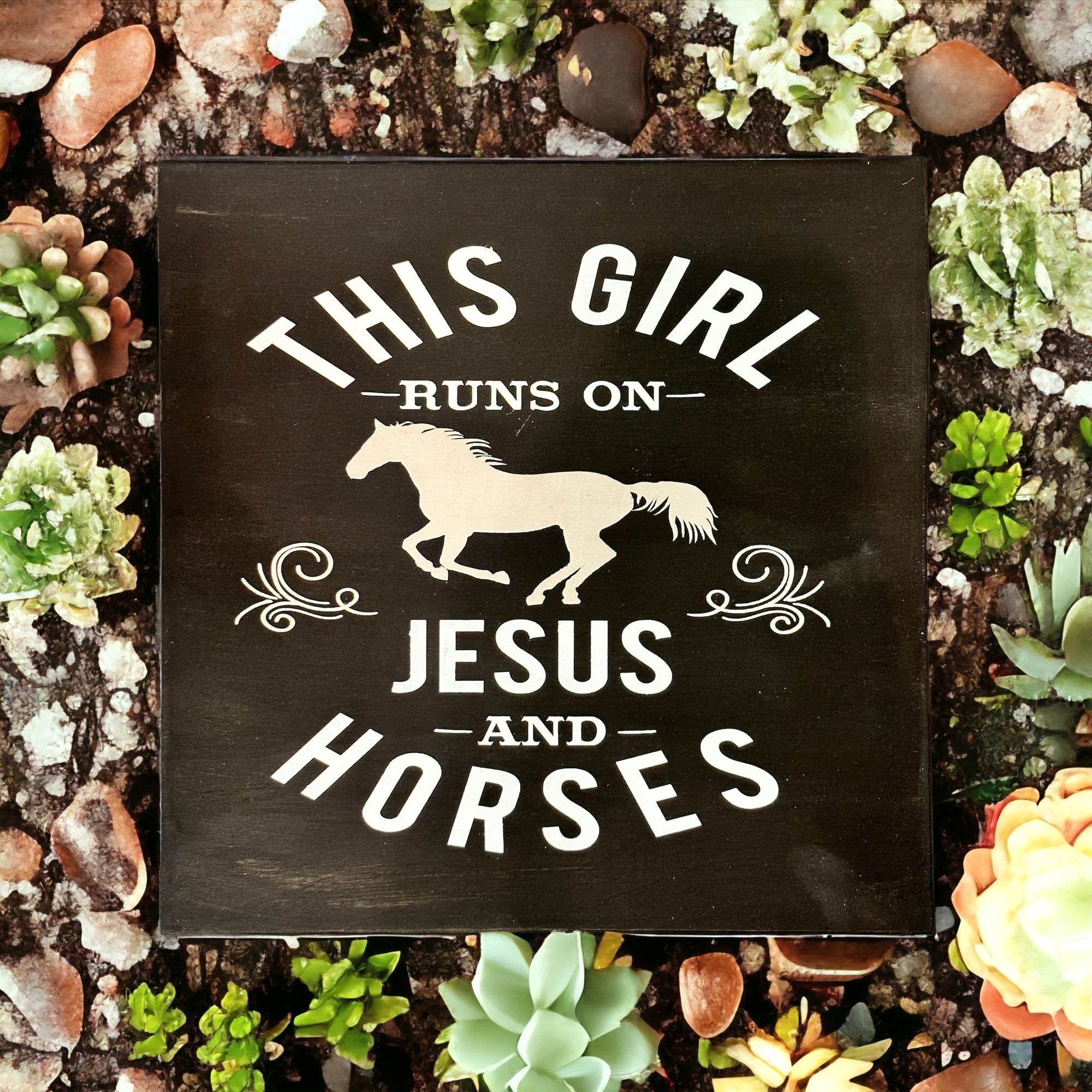 For the horse lovin', Jesus lovin' girl, this custom sign is the one for you! This fun square design features a horse silhouette accompanied by a fit phrase—it'll have everyone laughin' and smilin' at your faith-filled style. Saddle up and ride into the sundown with this one-of-a-kind sign!