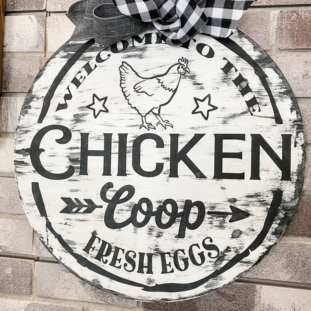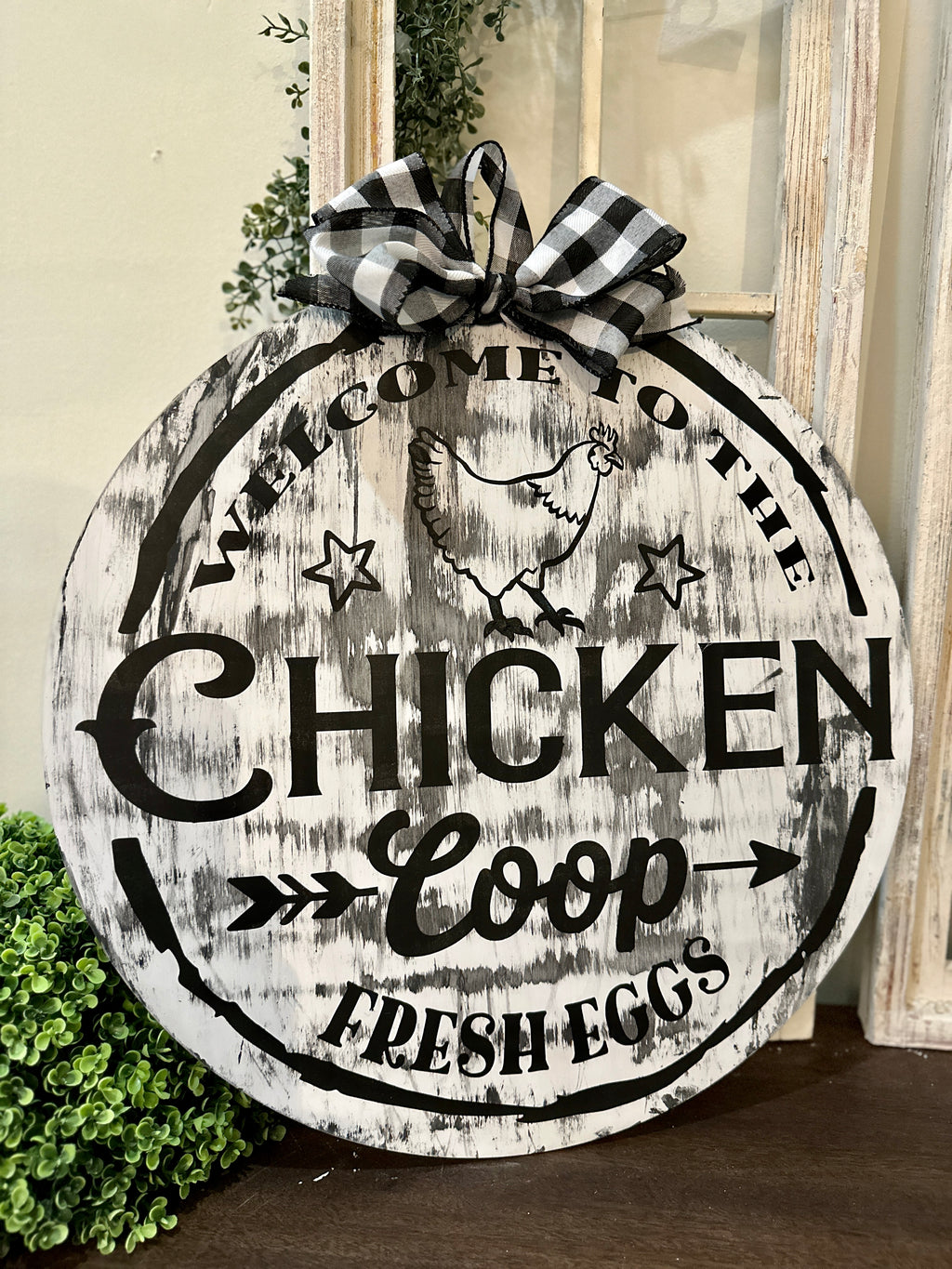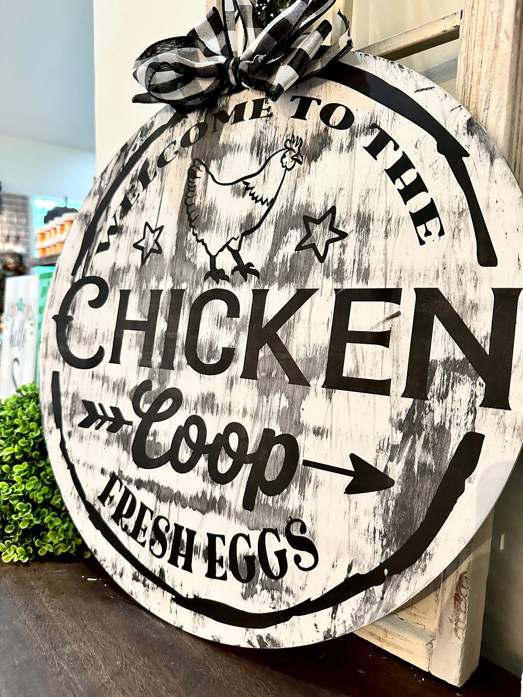 Welcome to the Chicken Coop! Kick the door down with this rustic, farmyard-inspired door hanger sign. Hang it up and you can cluck with confidence knowing your home is as cozy as a henhouse. (It even works as a roost for visitors who "strut" in!)